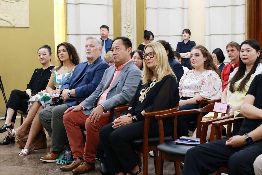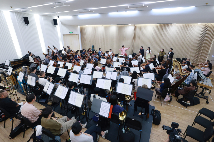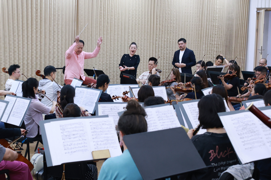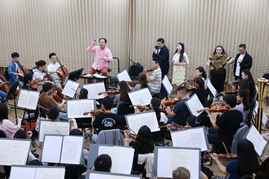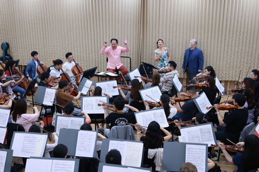于浩磊、茱莉娅·马佐拉、王潇希、何超排练歌剧《弄臣》选段“美丽的爱神” 。